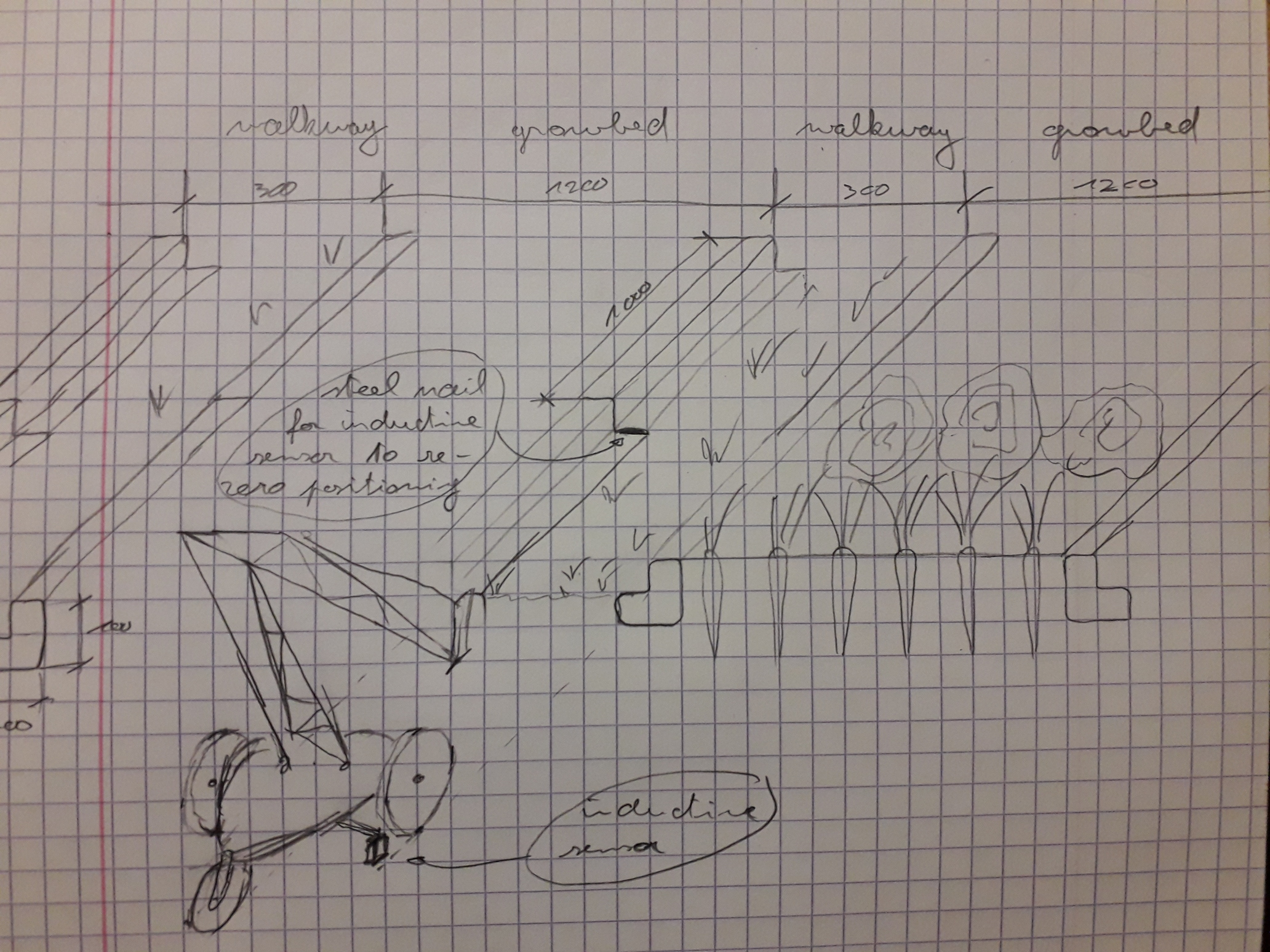 So I’m thinking about switching to another concept, without RTK, but possitioning on ‘rails’ of concrete L-profiles, encoders on drive wheels, re-zero every meter by magnetic detection (e.g. a nail dipped in construction glue in between the L-profiles), alternating between walkways and growbeds, and mounting the tools on an arm. concept sketch: