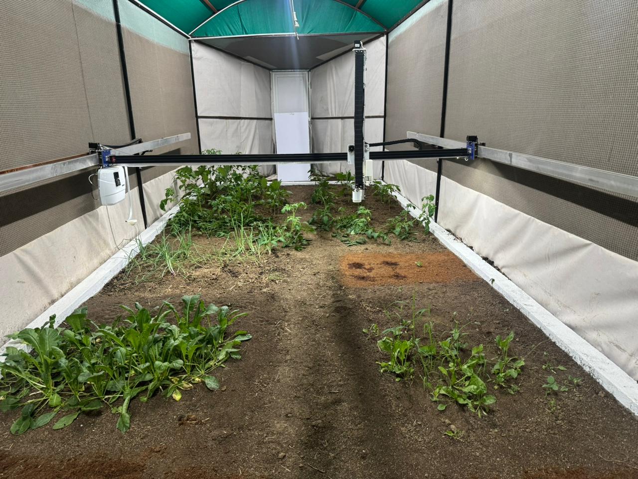 The full system is built from locally sourced and fabricated components here in India — no imported FarmBot kit. Everything from the tracks to the raised bed structure was designed and assembled ground-up.