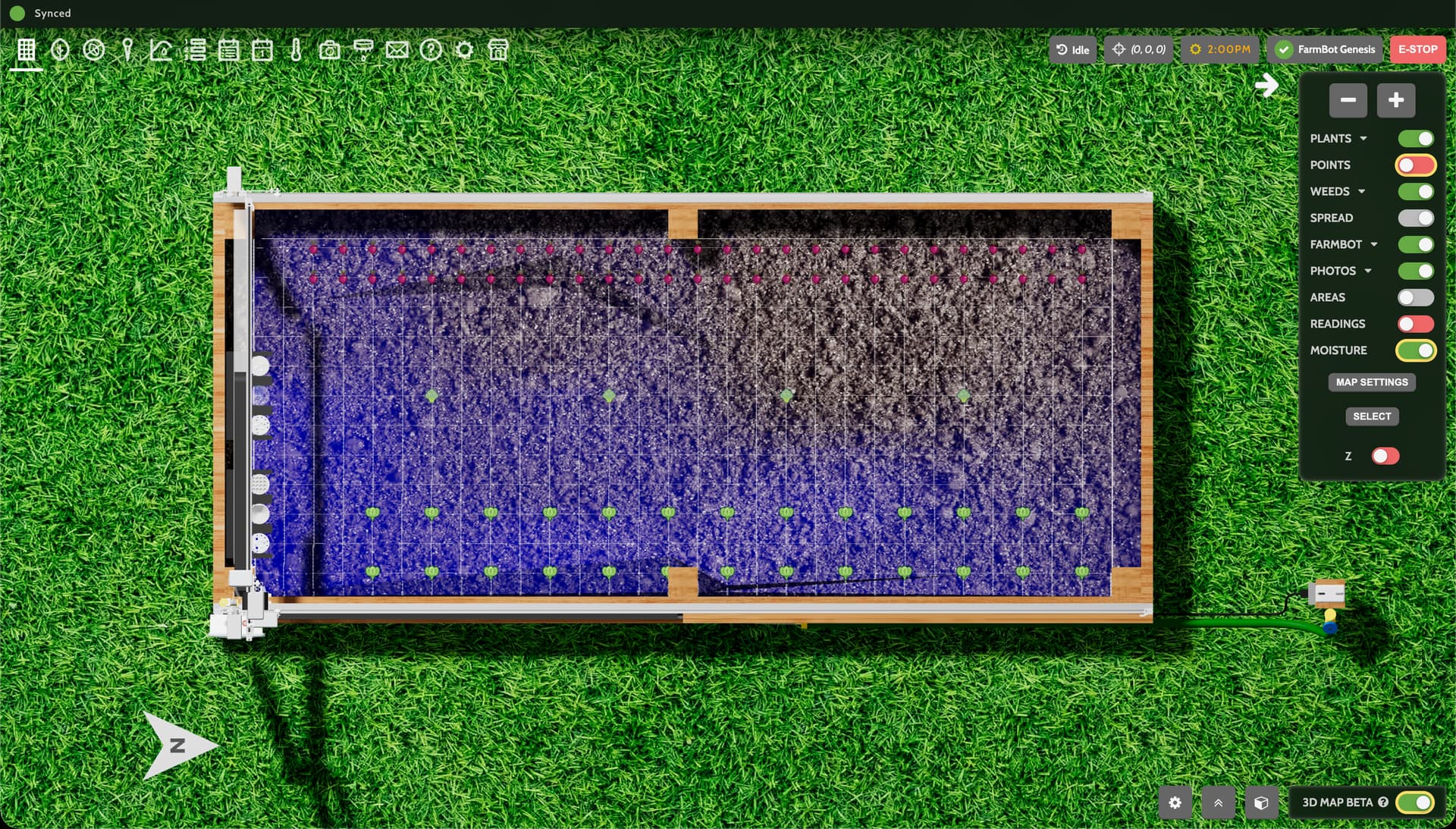 The 3D farm designer beta now renders an interpolated mapping of soil moisture sensor readings whenever the MOISTURE map layer is toggled on and you have gathered readings with the soil moisture sensor.