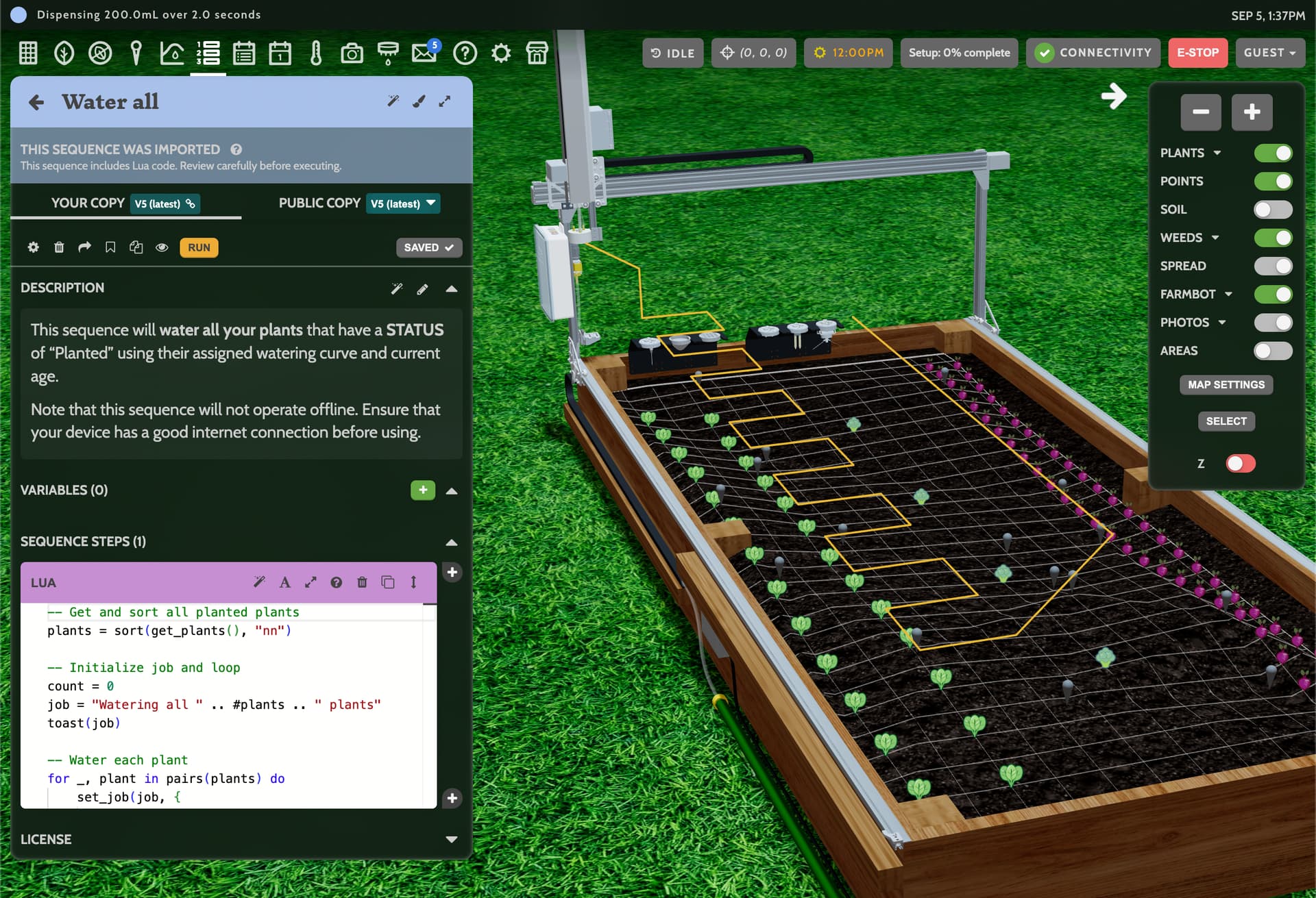 Building upon the new 3D sequence visualization features, demo account users can now simulate running full sequences (including those with Lua) and watch the virtual FarmBot move around, mount and dismount tools, operate the peripherals, and more. This has been a long-requested feature by our educational customers to allow students access to a virtual FarmBot before being given access to a real machine.